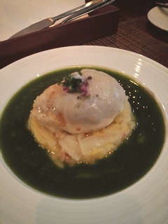 真鯛とホタテ・海老芋のクレピーヌ、白菜のブレゼ、春菊ソース。